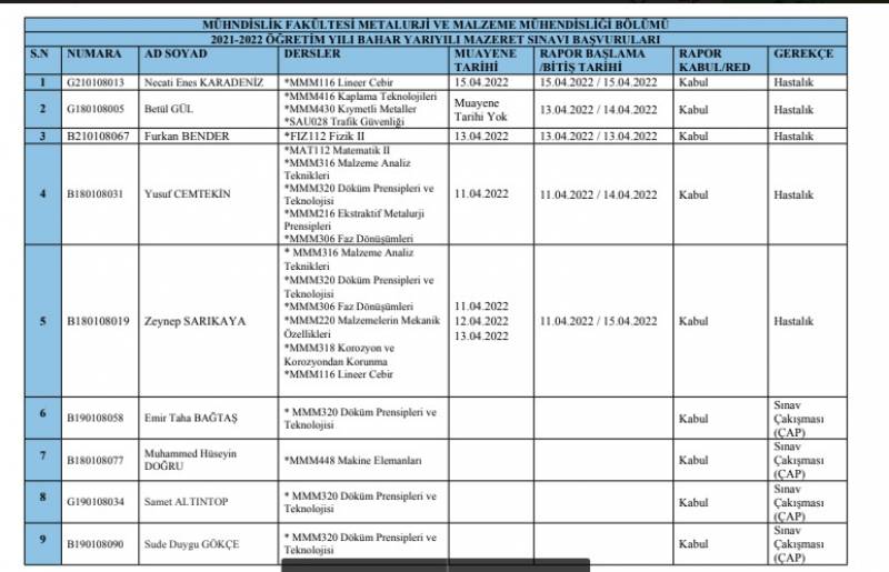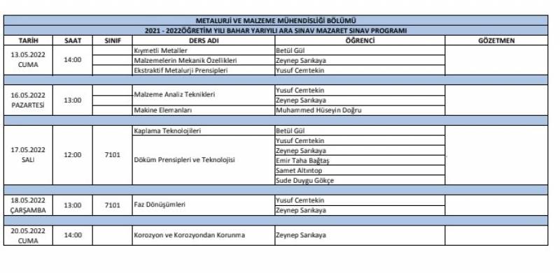 Metalurji ve Malzeme Mühendisliği öğrencilerinin Ara Sınav Mazeret Takvimi ekte verilmiştir.