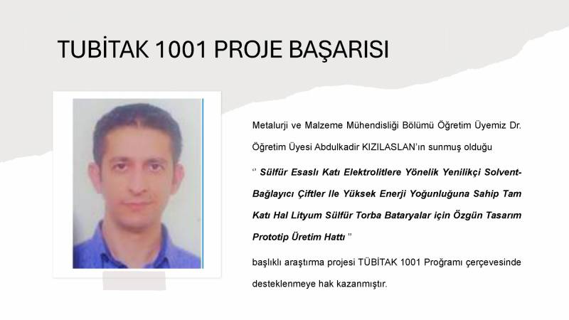 Bölümümüz öğretim üyelerinden Dr. Öğr. Üyesi Abdulkadir KIZILASLAN'ın yürütücülüğündeki ‘Sülfür Esaslı Katı Elektrolitlere Yönelik Yenilikçi Solvent-Bağlayıcı Çiftler İle Yüksek Enerji Yoğunluğuna Sahip Tam Katı Hal Lityum Sülfür Torba Bataryalar için Özgün Tasarım Prototip Üretim Hattı’ başlıklı TÜBİTAK 1001 projesi desteklenmeye hak kazanmıştır.