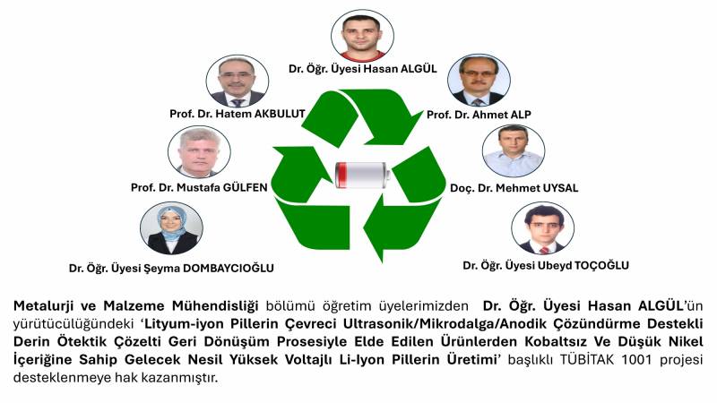Bölümümüz öğretim üyelerinden Dr. Öğr. Üyesi Hasan ALGÜL’ün yürütücülüğündeki ‘Lityum-iyon Pillerin Çevreci Ultrasonik/Mikrodalga/Anodik Çözündürme Destekli Derin Ötektik Çözelti Geri Dönüşüm Prosesiyle Elde Edilen Ürünlerden Kobaltsız Ve Düşük Nikel İçeriğine Sahip Gelecek Nesil Yüksek Voltajlı Li-Iyon Pillerin Üretimi’ başlıklı TÜBİTAK 1001 projesi desteklenmeye hak kazanmıştır.
