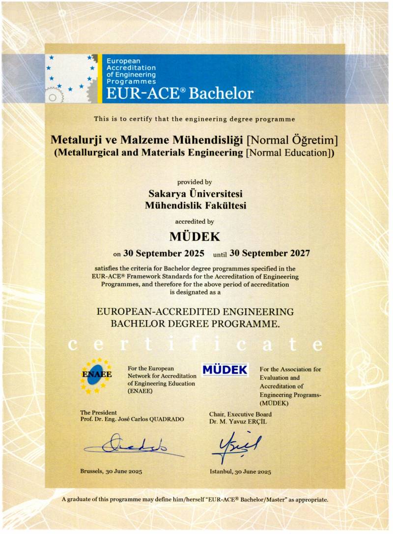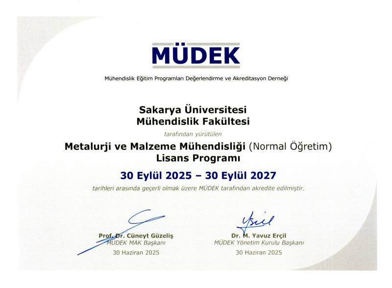 Metalurji ve Malzeme Mühendisliği Bölümü Normal Öğretim Programı, 23-25 Şubat 2025 tarihleri arasında, 2024-2025 döneminde MÜDEK Mühendislik Eğitim Programları Akreditasyon Kurulu tarafından yapılan yeniden Genel Değerlendirmesi sonucunda, 30 Eylül 2025 tarihinden itibaren 30 Eylül 2027 tarihine kadar geçerli olmak üzere 2 yıl süreli Ara Rapor Koşullu akreditasyon ve EUR-ACE Etiketi verilmiş olup sertifikalar ekte gönderilmiştir.