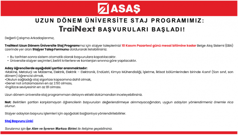 ASAŞ uzun dönem üniversite staj programı TraiNext başvuruları başlamıştır. Ekte bilgilendirme ve tanıtım dokümanı verilmiştir.
