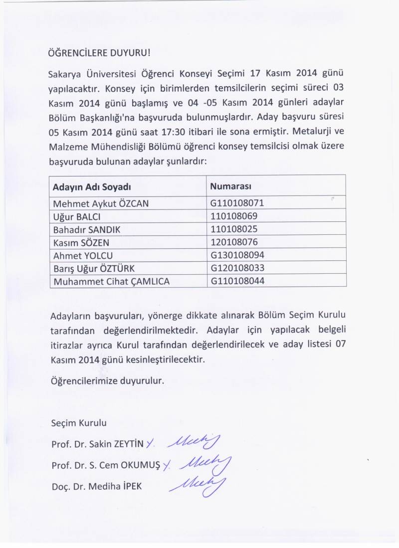 Sakarya Üniversitesi Öğrenci Konseyi Seçimi 17 Kasım 2014 günü yapılacaktır. Konsey için birimlerden temsilcilerin seçimi süreci 03 Kasım 2014 günü başlamış ve 04-05 Kasım 2014 günleri adaylar Bölüm Başkanlığı'na başvuruda bulunmuşlardır. Aday başvuru süresi 05 Kasım 2014 günü saat 17:30 itibari ile sona ermiştir. Metalurji ve Malzeme Mühendisliği Bölümü öğrenci konsey temsilcisi olmak üzere başvuruda bulunan adaylar şunlardır: