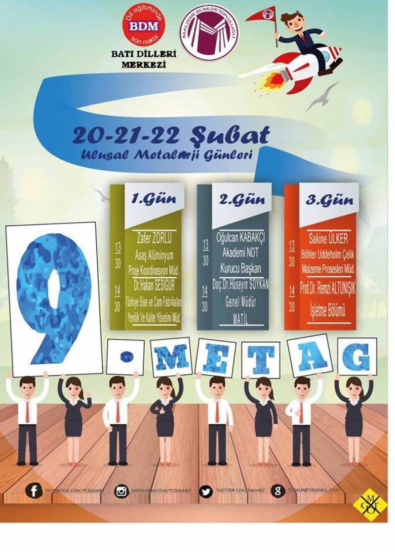 Sakarya Üniversitesi Malzeme Bilimi Topluluğu'nun (SAÜMBT) her yıl düzenlediği Ulusal Metalurji ve Malzeme Günleri etkinliğinin bu yıl 9.'su 20-21-22 şubat tarihlerinde Sakarya Üniversitesi Kongre Merkezinde gerçekleşecektir. Etkinliğe sektördeki önemli firmaların tecrübelerinden yararlanmak, sektöre dair merak ettiklerini sormak ve kendine değer katmak isteyen herkes davetlidir.