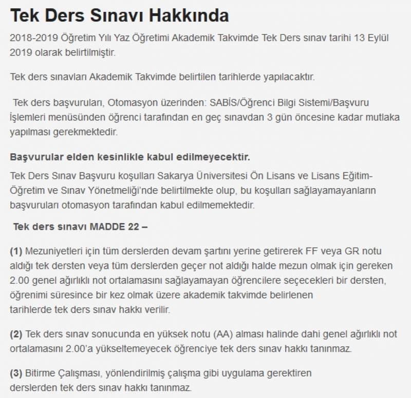 Tek ders başvuruları, Otomasyon üzerinden: SABİS/Öğrenci Bilgi Sistemi/Başvuru İşlemleri menüsünden öğrenci tarafından en geç sınavdan 3 gün öncesine kadar mutlaka yapılması gerekmektedir.