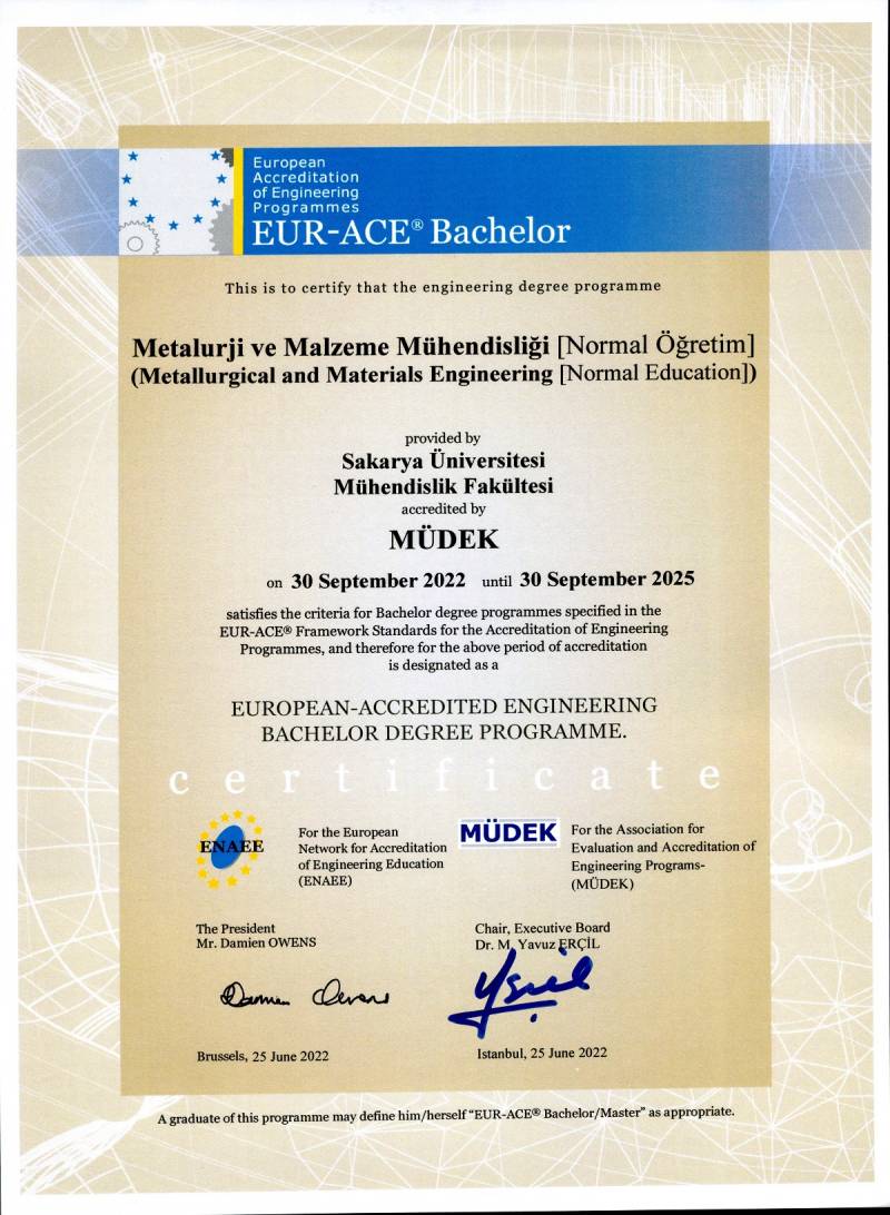 Sakarya Üniversitesi Mühendislik Fakültesi tarafından yürütülen Metalurji ve Malzeme Mühendisliği Lisans Programı (Normal ve ve İkinci Öğretim) 30 Eylül 2025 tarihine kadar MÜDEK tarafından akredite edilmiştir. (Bkz. https://www.mudek.org.tr/tr/akredit/akredite2023.shtm)